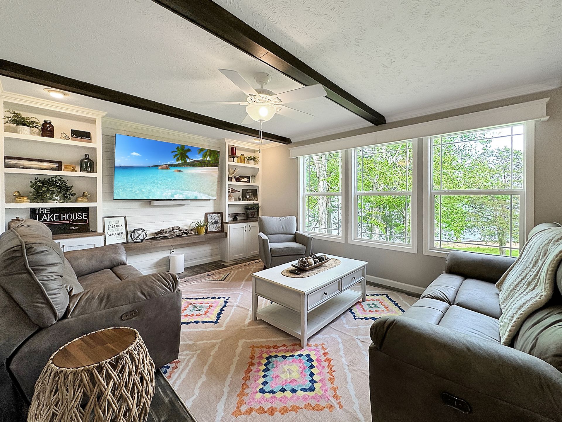 Inside the home, there are unique decor touches and antique design elements catered to the life of Kentucky Lake. Each bedroom has a lake centric theme from bass fishing, canoe paddles, and local duck species. There is photography throughout the home with images taken in the Land Between the Lakes National Recreation Area, Kentucky Lake, and Barkley Lake. The living areas consist of numerous windows to take in all the wonderful views of the lake.